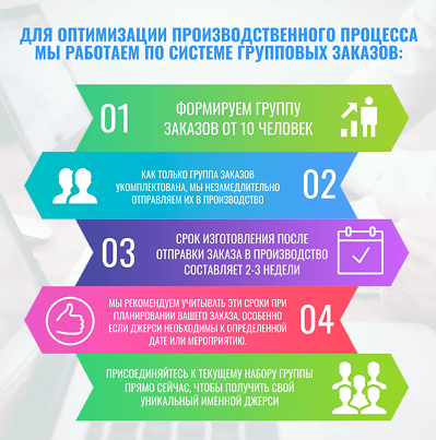 Для оптимизации производственного процесса и обеспечения выгодных условий для наших клиентов мы работаем по системе групповых заказов.