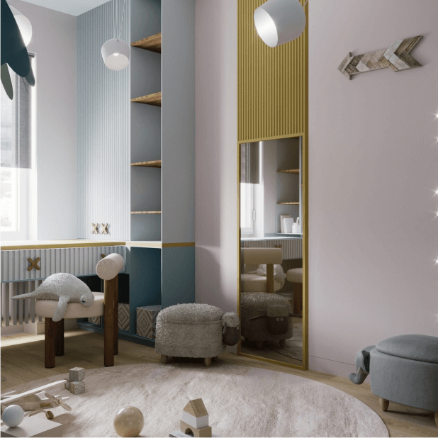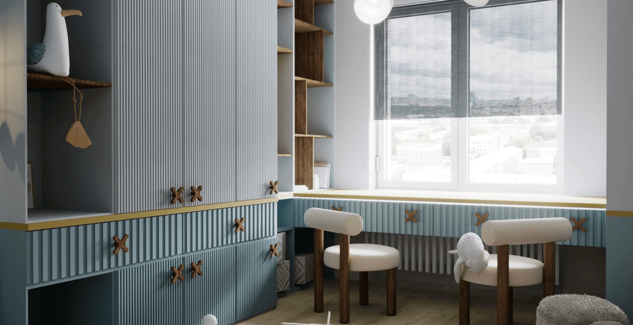 Мест для хранения запланировано сразу много — количество шкафов не придется увеличивать, когда ребенок станет подростком.
