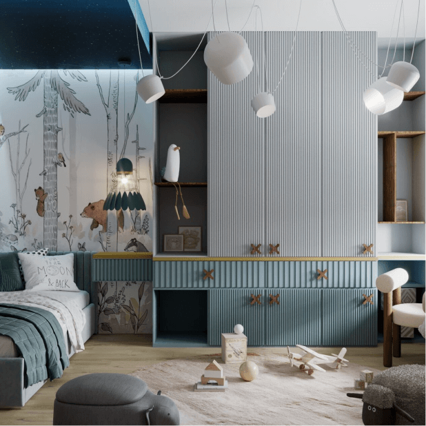 Вся мебель выполнена на заказ, на стене — качественные фотообои с лесной тематикой, а над кроватью предусмотрена стильная неоновая подсветка, которая наверняка понравится малышу.