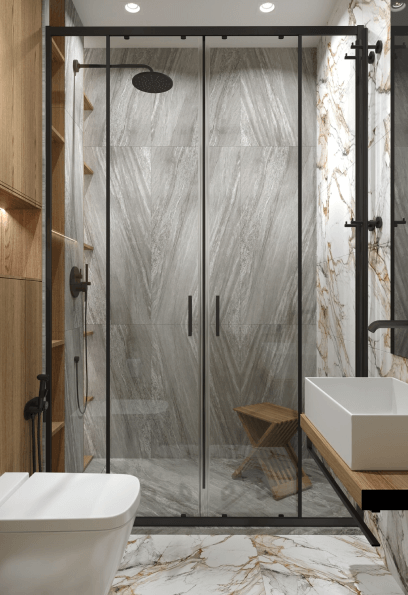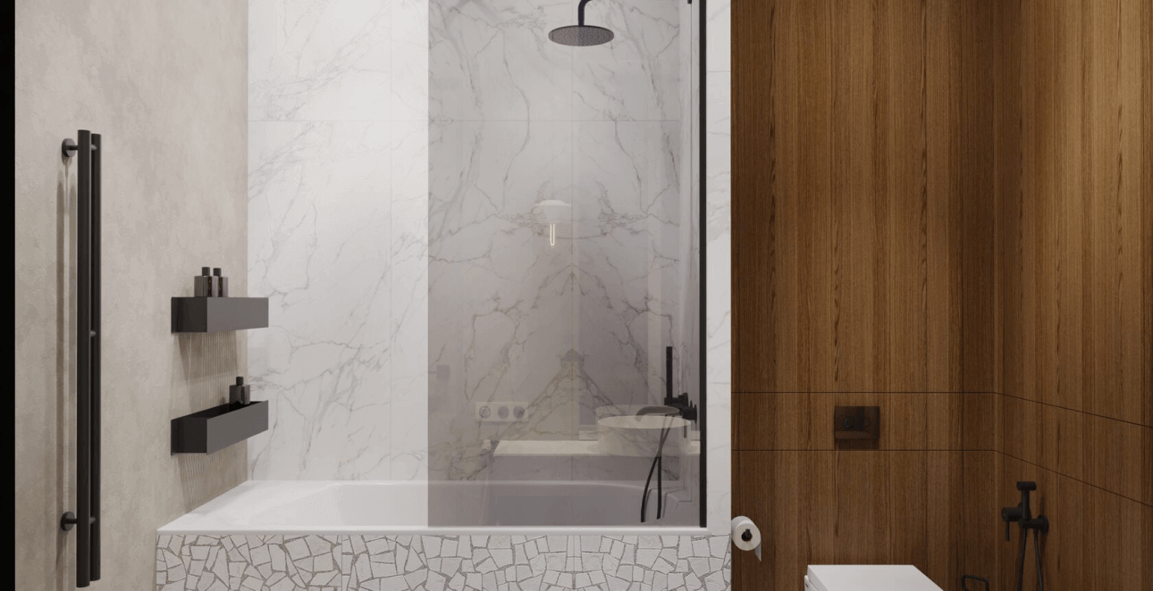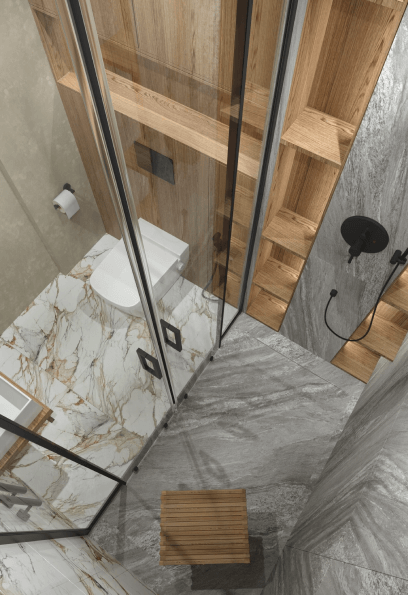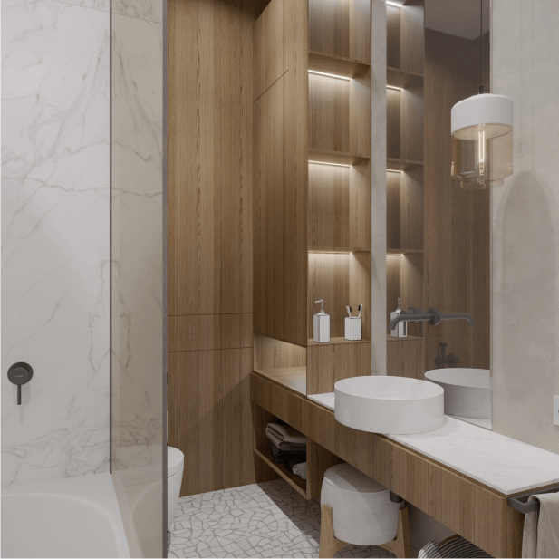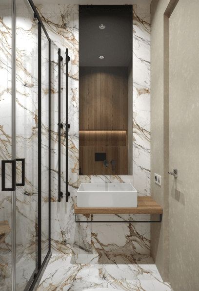 Гостевой санузел привлекает внимание акцентной отделкой в керамограните под серый бразильский гранит Dark Cosmo и белый итальянский мрамор с золотыми прожилками, которые мы уже видели на кухне. Яркий контраст этих материалов и дерева в МДФ делает интерьер эффектным и модным.