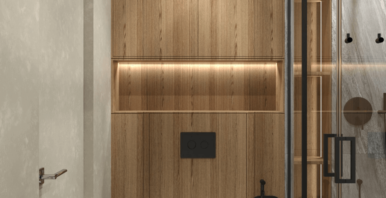 Среди приятных бонусов: зеркало до потолка, встроенная подсветка, много места для хранения мелочей и дверь-невидимка.