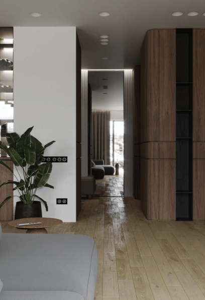 Клиенты — супруги с сыном-школьником, мечтали видеть свою квартиру простой, но элегантной. Они хотели получить дом с минимумом декора, где акцент поставлен на качественных материалах отделки, тактильных характеристиках и ощущении простора.