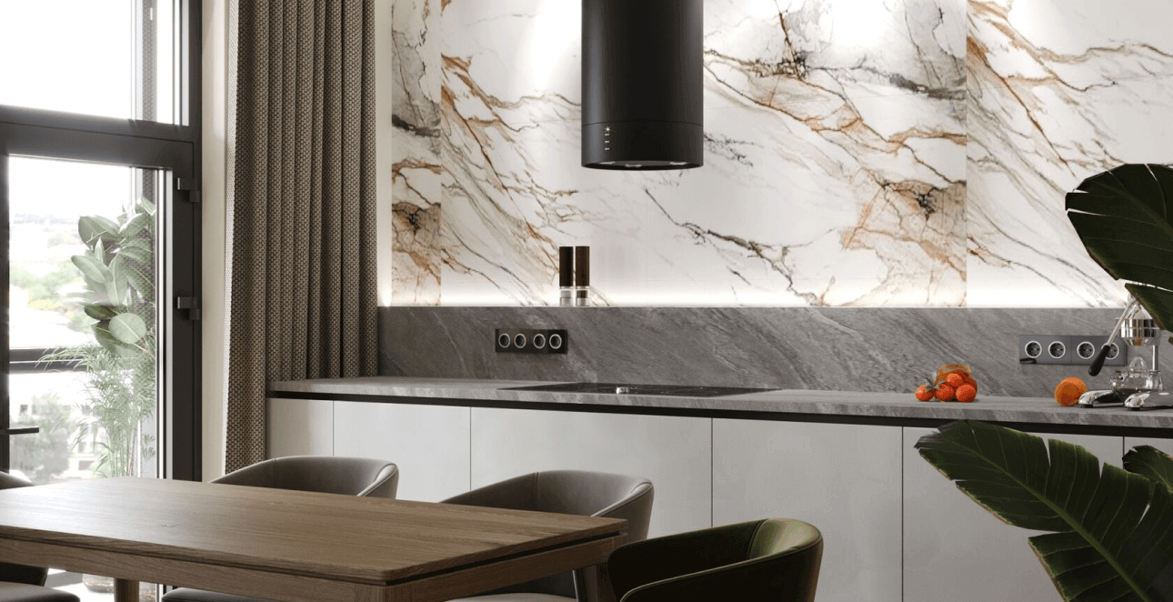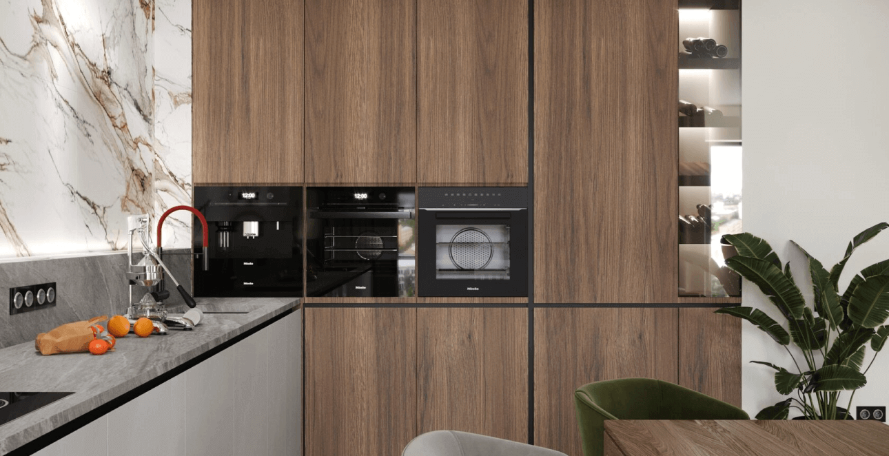 Так было решено реорганизовать пространство, объединив кухню и гостиную, выбрать отделку из крупноформатного керамогранита и инженерной доски (шпонированной натуральным деревом).