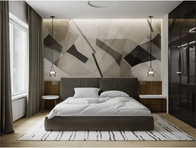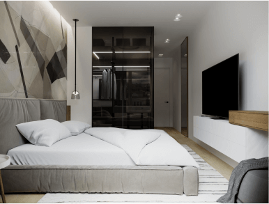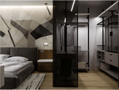 В спальне доминируют темные оттенки и геометричный принт. Эта комната может похвастаться современной гардеробной в стеклянном боксе, встроенной подсветкой и супер-удобной кроватью с низкой посадкой, обитой велюром.
