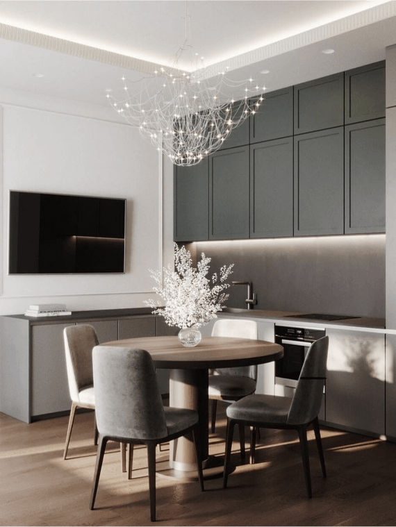 В интерьере маленькой кухни-гостиной мы использовали модный светильник в стиле контемпорари с параметричными элементами.