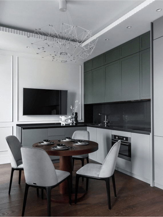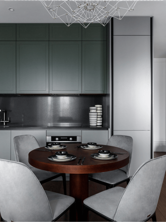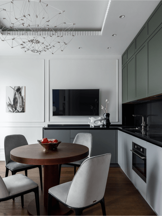 Этот проект получился особенно элегантным и при этом современным. Мы использовали кухонный гарнитур и кровать от Dantone Home — нашей любимой марки мебели!