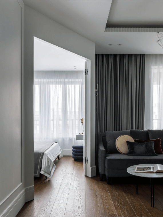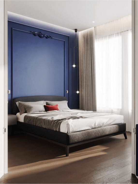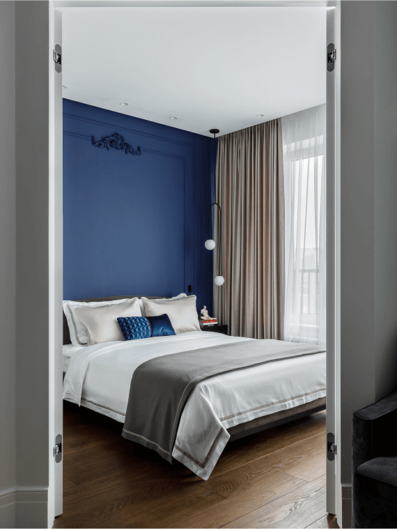 Пол оформлен инженерной доской из натурального дуба. На стенах вы видите молдинги, окрашенные в цвет стен. А серый диван от Furman в стиле mid-century modern обит бархатом мышиного оттенка. А стены в спальне мы покрасили в полуночный синий.