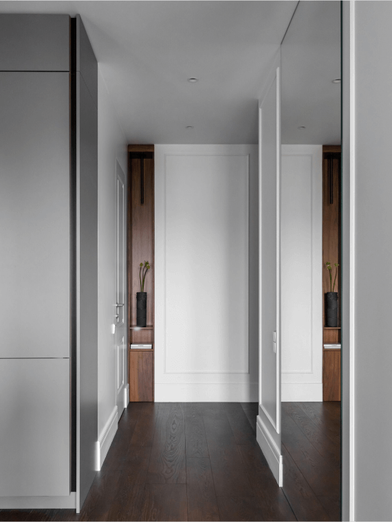 Интерьер этой квартиры выдержан в нейтральной пепельно-дымчатой цветовой гамме и стиле неоклассика.