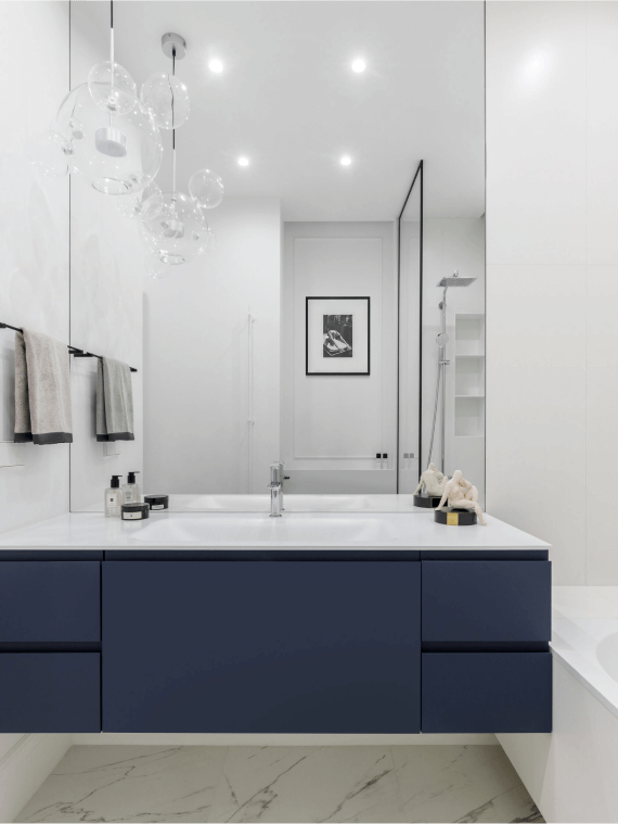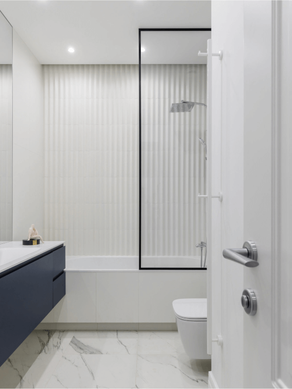 В ванной комнате — сочетание трех материалов: полированного керамогранита под белый итальянский мрамор (на полу), 3D-плитки (на акцентной стене) и дополнительной белой однотонной плитки (в оформления ванной чаши). Стеклянный экран для чаши сделан на заказ. Также вы найдете здесь удобный подвесной унитаз со встроенным в стену сливным бачком.