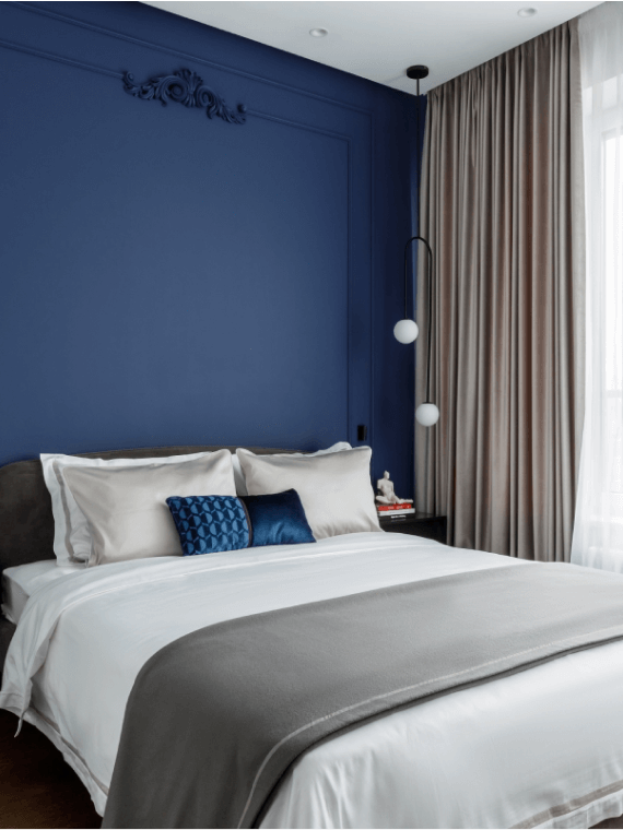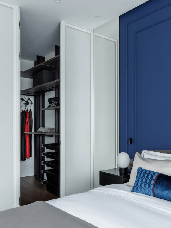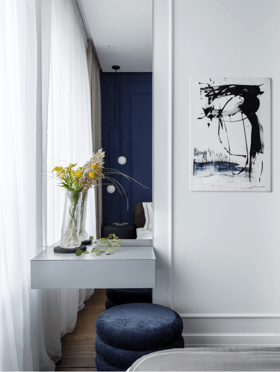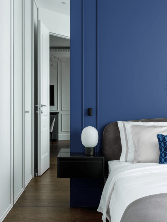 Акцентную стену в спальне мы покрасили в модный кобальтовый синий оттенок и дополнили молдингами. Кровать бренда Dantone Home была куплена за 120 тысяч рублей. Гардероб от Union изготовлен на заказ по эскизам нашего дизайнера, а пуфик от бренда Ferm Living красиво украсил в спальне будуарную зону.