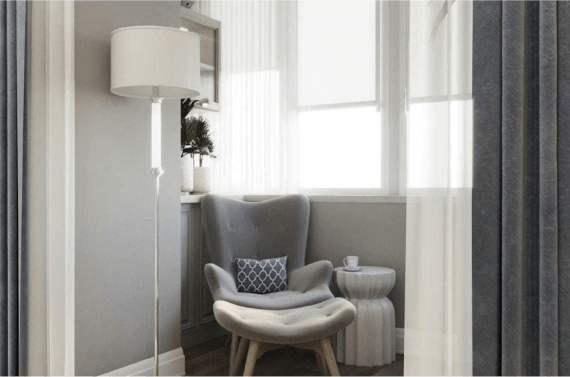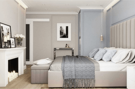 Нежная спальня, оформленная в светлых тонах, привлекает внимание стильной отделкой молдингами под покраску. В процессе ремонта к ней была присоединена лоджия, на которой теперь обустроен уголок для отдыха с полукреслом. Напротив кровати дизайнеры запланировали фальш-камин. Также в комнате есть встроенные системы хранения с подсветкой.