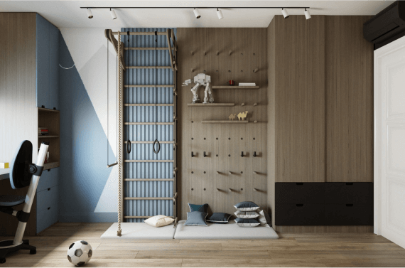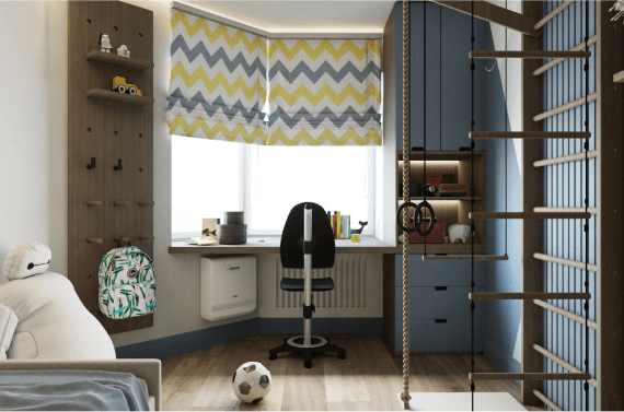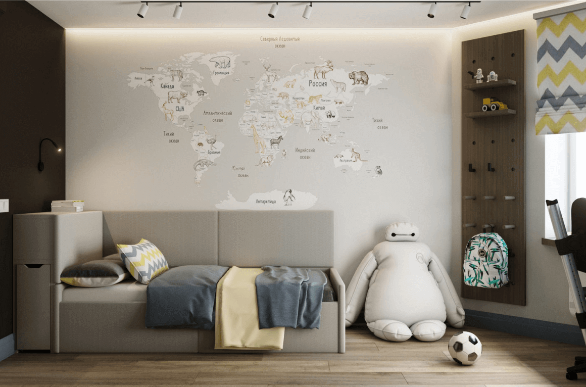 Этот интерьер детской спальни выполнен для мальчика-школьника возрастом 7 лет. У окна оформлена рабочая зона, тогда как центр комнаты отдан под активные игры.