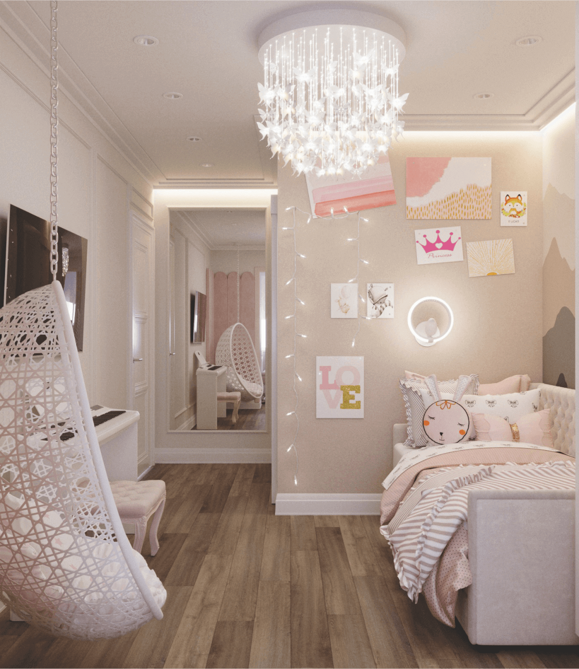 Деревянная мебель на заказ в детской девочки (шкафы, ящики, стеновые панели, рабочая зона) обошлась в 280.000 рублей. Отдельно люстра Sagarti TENEA MINI SHPERE — 90.000 рублей, кровать DEVYN DAYBED — 90.000 рублей, подвесное кресло EASY WHITE BS — 10.000 рублей.
