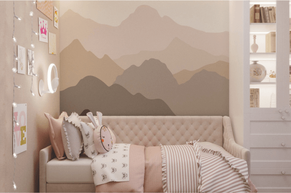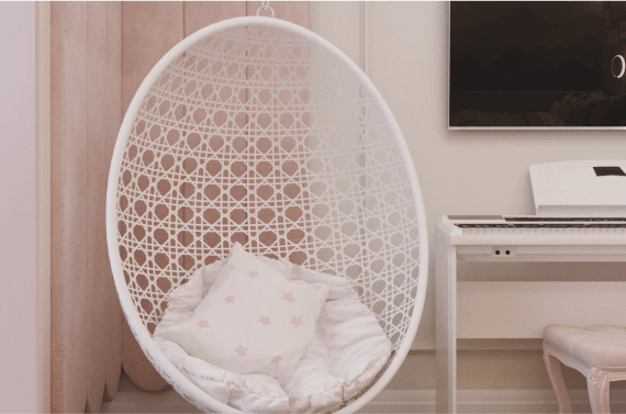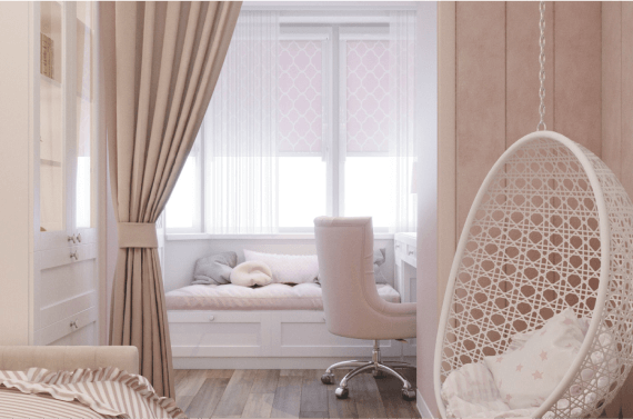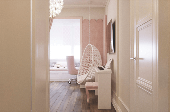 Нежный интерьер в розовых тонах мы создали для девочки возрастом 12 лет, которая играет на пианино. На присоединенной лоджии — мягкое местечко у окна и кабинетная зона.