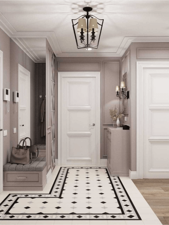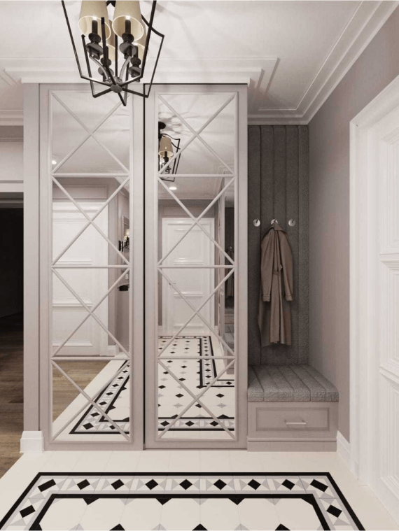 В стильной прихожей с полом во французском стиле есть встроенные гардеробы с фацетной отделкой, дополнительные пуфик и тумба для обуви. Отделка стен здесь предусматривает молдинги и покраску в нежный кофейный оттенок.