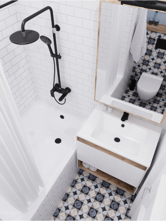 Маленькую ванную комнату делят между собой брат и сестра. Здесь дизайнеры решили создать современный, яркий интерьер с полноценной ванной чашей и большим полотенцесушителем.