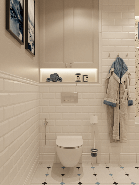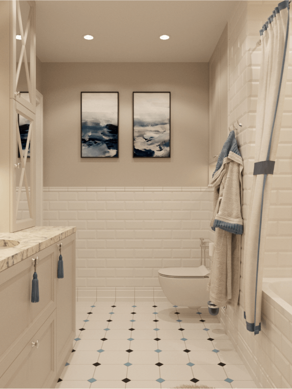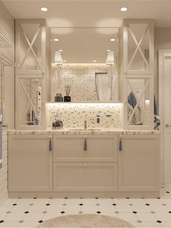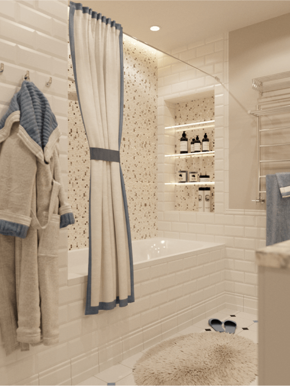 Атмосферная ванная комната с отделкой белой плиткой под кирпич, стеклянной мозаикой и керамогранитом в французском стиле выполнена в пастельных тонах. Мы добавили в интерьер ниши со встроенными полочками и поставили тумбу с зеркальными шкафчиками.