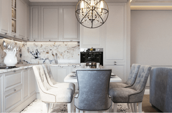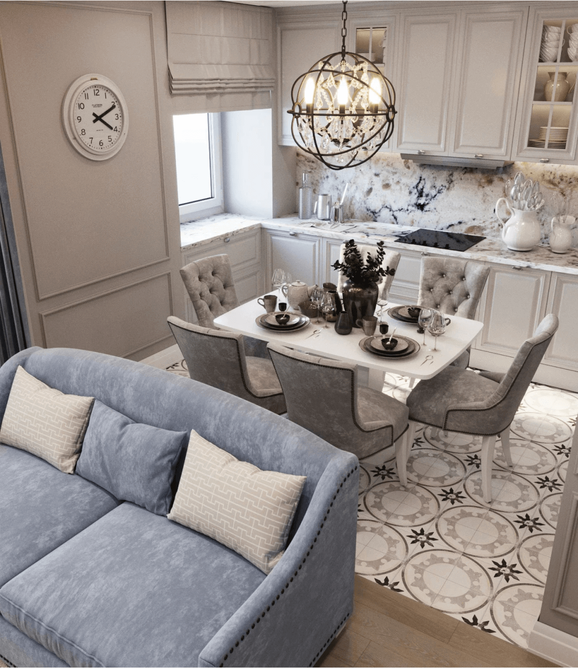 Атмосферная кухня с отделкой столешницы и фартука керамогранитом под мрамор смотрится просто потрясающе. Нежные голубые акценты на сером фоне создают приятную атмосферу для отдыха в кругу семьи. Отделка пола выполнена плиткой с узором-арабеской в пастельной цветовой гамме.