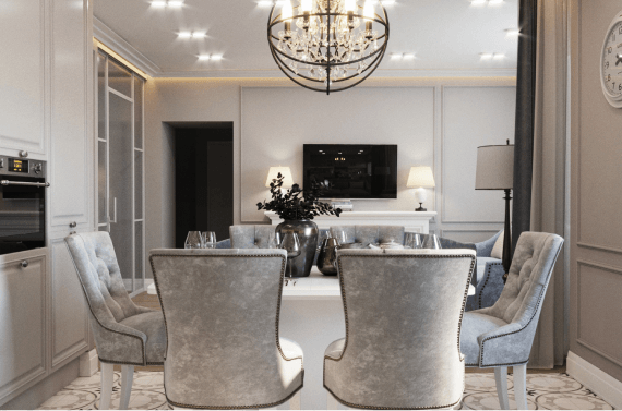 Семейная пара обратилась к нам с просьбой оформить в стиле неоклассика их просторную квартиру площадью 130 м². Клиенты сразу знали, что хотели: нейтральные оттенки, нежные акценты, открытую кухню-гостиную и максимально качественные материалы