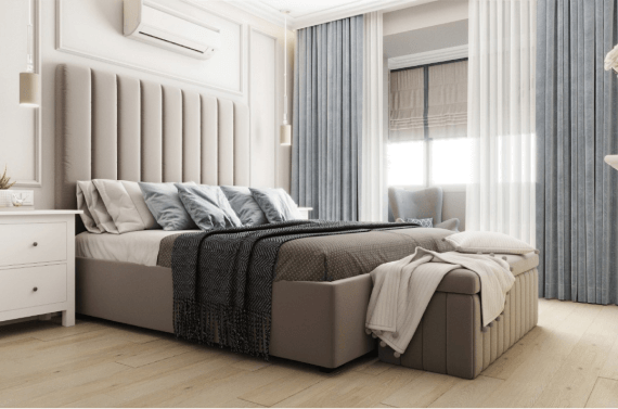 Кровать Lavanda 74.000 рублей, банкетка с хранением Mercer and Reid Kensington Collection Blanket Box 47.000 рублей, кресло Cosmorelax Contour 63.000 рублей + оттоманка 17.000 рублей. Портал фальш-камина Dimplex California под очаг Symphony 26 цвета алебастр 27.000 рублей, зеркальный консольный столик Дарлинг от Graumstore в серебре 31.000 рублей.